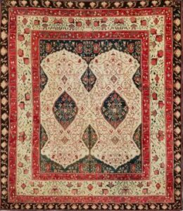 同じくサザビーズオークションにて2006年12月に39,000USDで落札された1875年製の判明している最古のサフとして絨毯書籍に掲載されたり美術館で展示されて有名なMichaelianサフ(シルヴァン製)が有りますが、それより7年古いので最古のサフ絨毯となります。勿論判明している内では最古で有りますが、今回の様に古さの更新がいずれ成されるかもしれません。