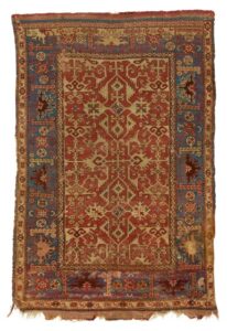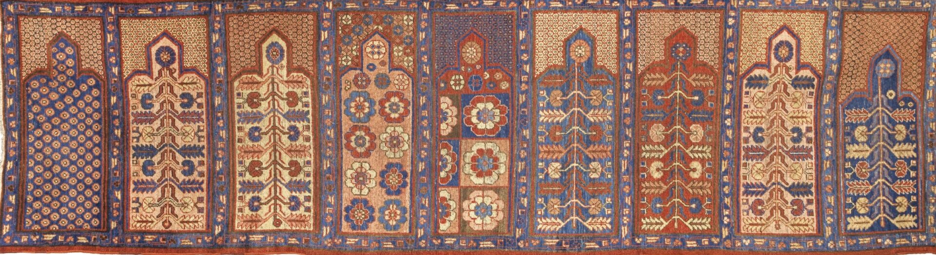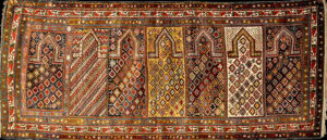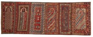 中でも非常に珍しい<並列祈祷用絨毯・サフ>が10,080GBPで落札されて居りました。それは東コーカサスのシルヴァンかクバで織られた6連のサフですが、1868年製と日付けが入って居り、現存するサフの中最も古いものです。