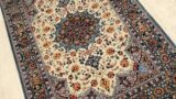 ペルシャ絨毯5大産地の一つで日本でも優美で落ち着いたデザインが人気のナインの絨毯ですが、今日、多くはアイボリー・ベージュのベースに・赤・青・緑の濃淡の色糸がパイルとして使われます。素材は綿の縦糸にパイルはウールを主材にシルクの縁取り(パートシルク)が一般的ですが、安価なウール100%の品もあります。