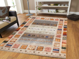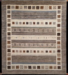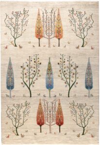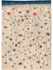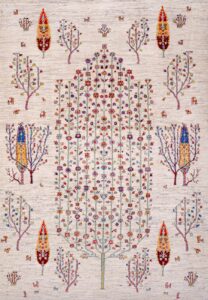 インド絨毯は元々ムガル帝国のアクバル大帝(1556–1605迄在位)が、ペルシャ絨毯職人をインドに招き技術を導入し宮廷絨毯として隆盛を極めた歴史を持ちますが、アクバル大帝の死後ムガル帝国の衰退と共に手織り絨毯も衰退し英国統治時代には低生産・低品質に陥った様ようです。最盛期のムガル絨毯は西へ東へと輸出され現在世界の美術館や日本の祇園祭りの山鉾飾りにも使われているほどの魅力ある絨毯でした。1947年英国からの独立後も低迷していたインドの絨毯産業ですが、その復興は1970年代後半より外貨獲得(政府による輸出振興政策)の為、職人を育成し安価を武器に成長し続け現在の世界一の絨毯輸出大国に成長しました。しかしこの秋米国トランプ関税50%の大打撃を受けてしまっている様です。現在インド絨毯は北部のバドイ、ジャイプール、アグラ、アムリトサル、カシミールなどが有名産地です。