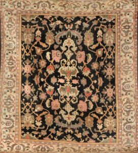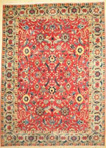 サファヴィー朝由来のペルシャ絨毯がカジャール朝1851年にロンドン万博に出品されたのをきっかけにロンドンの上流階級の中で芸術品として認識される様に成ります。その後もカジャール朝は1867年のパリ万博・1873年のウイーン万博・1878年のパリ万博と積極的に出展を重ね強いインパクトを欧州に与える事となりフランスやイギリスの上流階級のみならず中流階級にまで広がりを見せる様になり、ヨーロッパでペルシャ絨毯の一大ブームが巻き起こります。1880年代にはアーツ&クラフツの波も高くなりペルシャ中の手織り絨毯が、タブリーズに集められヨーロッパへの窓口イスタンブールを通じて欧州へ運ばれたと言われた程です。供給の乏しいペルシャ絨毯事情下、欧米の需要に応えるべく1980年代から1910年に掛けて英国・独国・米国などの企業が挙ってペルシャ(タブリーズ、ハマダン、ケルマン、スルタナバード、ヤズドなど)に工場・工房を設立し、欧米好みのデザイン・サイズで製造し輸出する様に成ります。それに刺激を受けたタブリーズの商人達も各地で絨毯製作に乗り出し一気に都市のペルシャ絨毯の復興がなされて行きました。